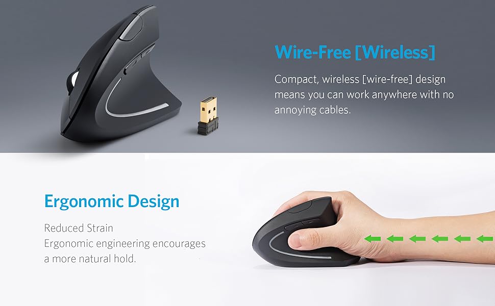 • Package includes: 1 Anker Wireless Vertical Ergonomic Optical Mouse (2 AAA batteries not included), 1 instruction manual. 18-month hassle-free warranty.
