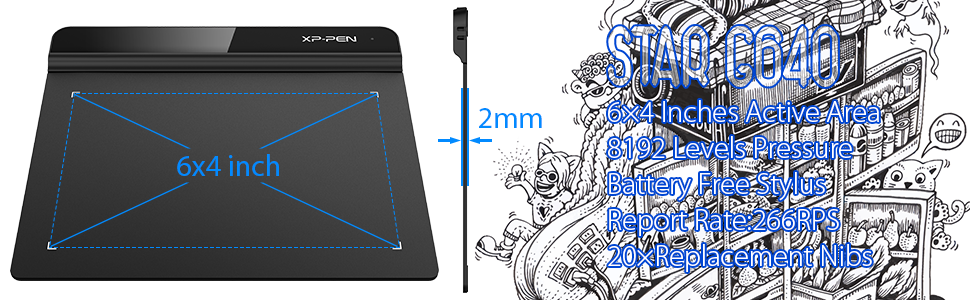 Package Contents: 1x Tablet / 1x USB Cable / 1x Passive Pen / 1x Quick Guide / 20x Replacement Nibs / 1x Pen-Clipper